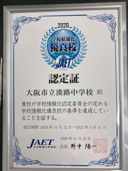 かねてよりJAET(日本教育工学協会)へ『学校情報化優良校』申請をあげて来ましたが、ICT教育実践推進の努力の甲斐あって、この度めでたく優良校認定を受けました。