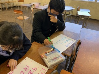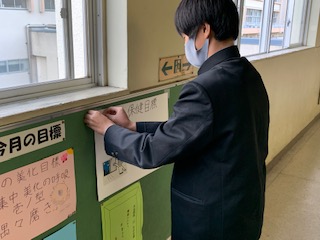 12月の月間目標を議論し、決定したスローガンをポスターにして、各学年の教室や廊下に目標を掲示していきました。