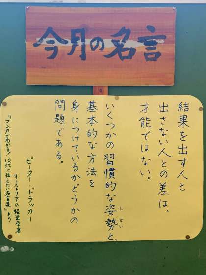 図書室で学校図書の管理、貸出等の執務してもらっている学校図書館補助員の酒井さんが、毎月含蓄のある名言を図書室前掲示板に掲示してくれています。