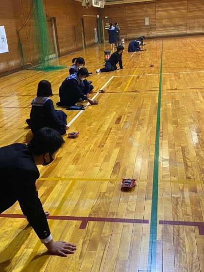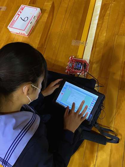 技術科では、3年の授業でロボットを使ってプログラミング学習をしています。自走式ロボットの軌道制御を生徒一人ひとりがタブレット端末を使ってプログラミングし、目的地まで自走し停止させる迄をプログラム修正を加えながら、達成していきます。