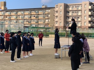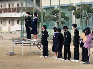 会長の挨拶のあと、表彰状の伝達式があり、バスケットボール ジュニアオールスターズU-13選抜選手に選ばれた女生徒の表彰と先週金曜日に行われたマラソン大会の優秀選手の表彰を行いました。