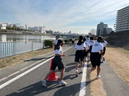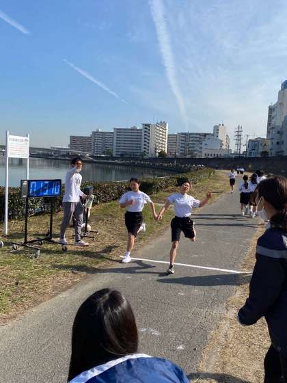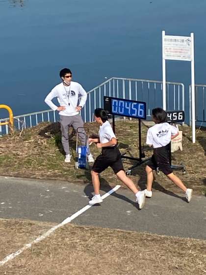 女子、折り返し地点を過ぎてスタート地点を通過、更に折り返してスタート地点でゴールです。