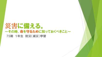 16日は本校教員より、「災害に備える。〜その時、命を守るために知っておくべきこと〜」ということで、「災害とは何か」、「災害が起こるとどうなるのか」をテーマに、中学生が防災学習をする意義や避難をするときに気を付けなければいけないことを勉強しました。