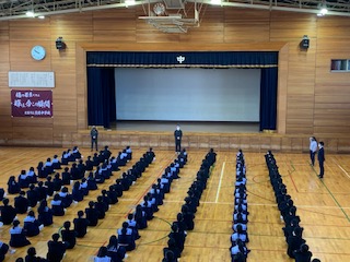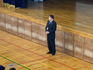 その後の校長先生からのお話は、本年度のスタートを振り返り、大変な1年間である中で、生徒たちがコロナに負けずしっかりと学校生活を過ごしてきたことをほめられ、次年度4月8日に後輩を迎え、新たな学校生活のスタートに向けて、各自自らを振り返り部活動部長会議の提案で生徒自らが取り組みを進めてきた、「人が気持ちよくなる大阪一のあいさつができる淡路中学校」をしっかりと取り組んで欲しいとお話されました。