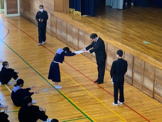1・2学年の各生徒代表に校長先生から修了証が授与され、各学年での学校生活が終了しました。