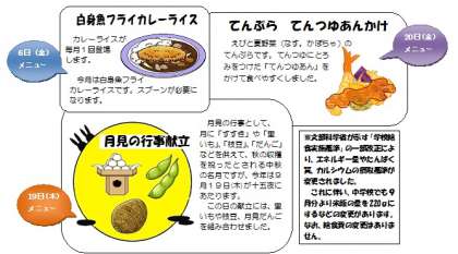 また、画面右側にある「配布文書」の「お知らせなど」に「9月分給食申込案内」としてアップしています。あわせて、「中学校給食における就学援助費について」もご覧ください。