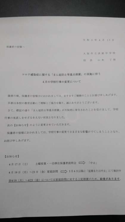 コロナ感染症に関する『まんえん防止等重点措置』の実施に伴う4月の学校行事の変更について、本日生徒に配布していますので、各ご家庭でご確認下さい。