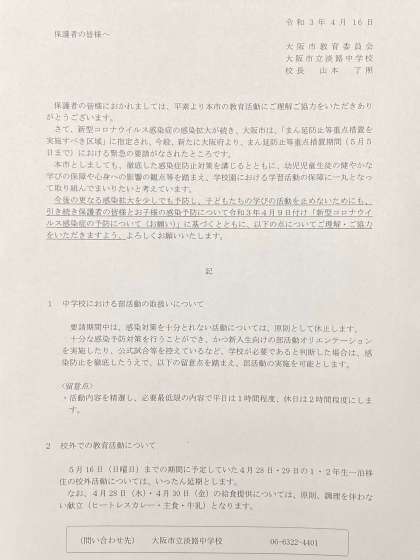とりわけ部活動については、活動時間の短縮の上の実施となります。顧問からの部員への周知連絡をお子様から聞いておいて下さい。