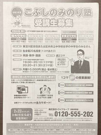本年度から本校でもスタートした『民間事業者を活用した課外授業』こぶしみのり塾について、東淀川区役所から受講生追加募集のチラシが届きました。