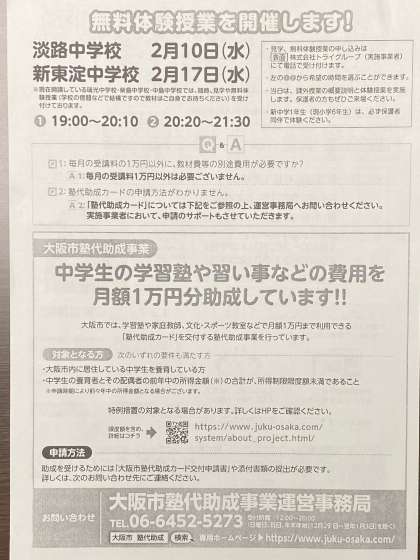 金曜日に生徒配布していますのでご覧おき下さい。まだ少しだけ席が確保できるようになったので、追加募集をしています。チラシでは無料体験会は、2月10日に終了していますが、見学や無料体験会も随時受付てくれるそうです。