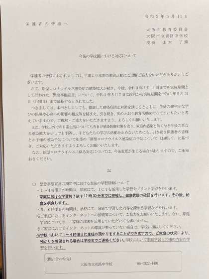 昨日、大阪市教育委員会より12日以降の『新型コロナウイルス対策感染症緊急事態宣言の延長に伴う学校園における対応について』通達がありました。