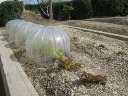 気温の変化が大きく急な雨に見舞われる日がつづいていますが、校内の菜園では手作りの温室内でお野菜がすくすく育っています。