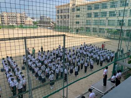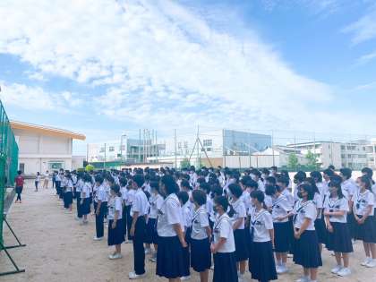 緊急事態宣言が明け、蔓延防止等重点措置期間に移行した事を受けて、オンラインによる全校集会をしてきましたが、本日すがすがしい梅雨晴れのもと久し振りに屋外で行いました。