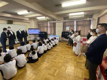 2社はそれぞれ1教室が充てがわれ、それぞれ工夫を凝らして、自社の制服をプレゼンテーションします。
