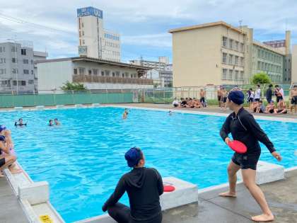 今回は、一般的な競技の他に、水の中を走る競技やディスクキャッチなど、その他様々なバラエティに富んだ競技を用意し、プールが苦手な生徒や入れない生徒も楽しめるように工夫しました。