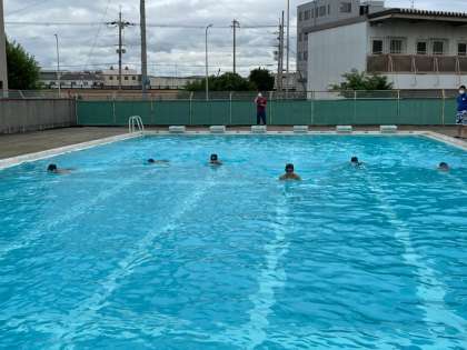 途中で足を着いてしまっても、プールサイドからの仲間の応援や、付き添って泳ぐ教員から励まされ、泳ぎ切ることができていました。