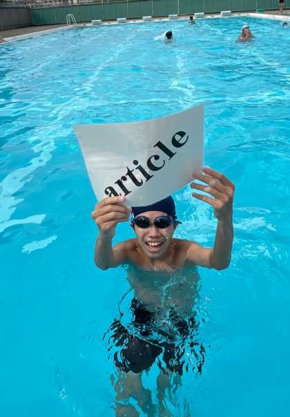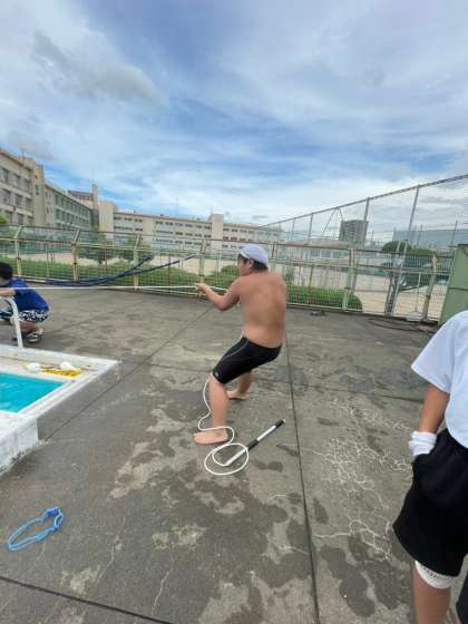 今回紹介するのは、英単語の意味を教員が言い、それに合った英単語を水中から拾ってくる、英単語拾い。ビート板とロープを掴んでいる生徒を、もう一方のロープをたぐり寄せる25mビート板引きです。