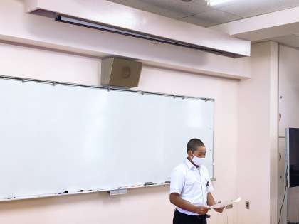 今年は新型コロナ禍の影響で、体育館での全校集会での密を避けて、会議室からのオンライン発信を行い、発表者以外は全員教室で報告を視聴しました。