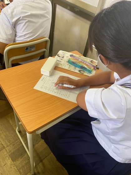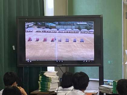 昨日は二学期始業式をオンラインで行いましたが、その後の学級活動では明日から始まる教育相談週間に向けた調査用紙の記入や、来月から始まる体育大会の取り組みの説明として、各学年で取り組む学年競技の昨年度のビデオを観たりしながら、2学期の学校生活を、シミュレートしました。
