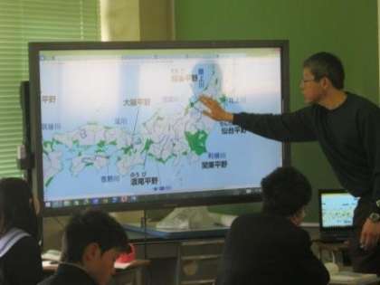 社会科では「日本各地の地形の特色」について学習しました。盆地や扇状地、三角州など、日本各地でみられる地形について、日本地図や航空写真を電子黒板に写しながら、なりたちや特色の説明がありました。電子黒板では(スマホと同じく)画像の拡大・縮小が自由に行え、見せたいポイントをわかりやすく示すことができるのでたいへん便利だと感じました。