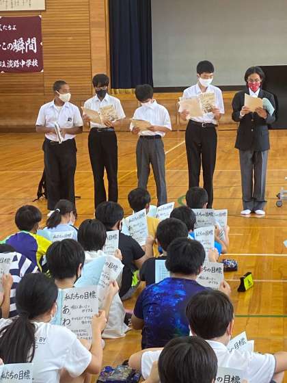 先週の金曜日の6時間目に本校の体育館で、次年度新入生となる西淡路小学校の6年生児童に向けて、本校の生徒会執行部が『中学校生活』とはを資料と映像で説明会を行いました。とは言っても西淡路小学校と本校は小中一貫須賀の森学園として、6年生は金曜日中学校登校や部活動体験など、日常を通して中学校生活は体験済み。