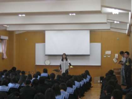 春休み以降、生徒(修学旅行委員)の皆さんが、しおり作成をはじめ夜のレクリエーションや事前準備など、さまざまな活動に取り組んでいます。今日の学年集会では、飛行機やバス内でのマナーや持ち物についての諸注意を自作自演のビデオ映像で紹介していました。