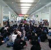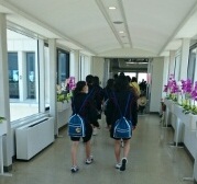 いよいよ沖縄に到着しました。南国のきれいな花の飾られた通路を抜けて、那覇空港内に入っていきました。