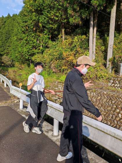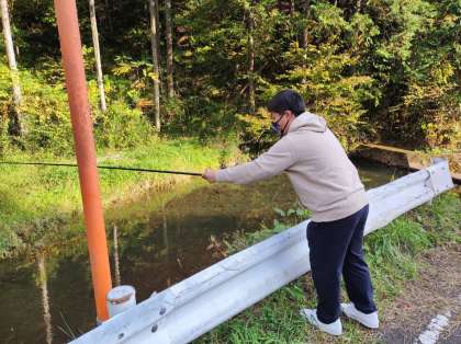 この班は、渓流での魚釣りを楽しんでいます。釣れたのはモツゴかな?