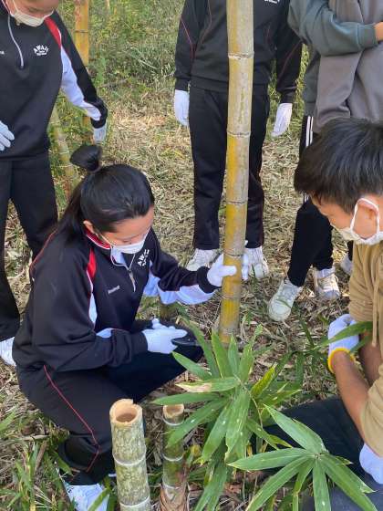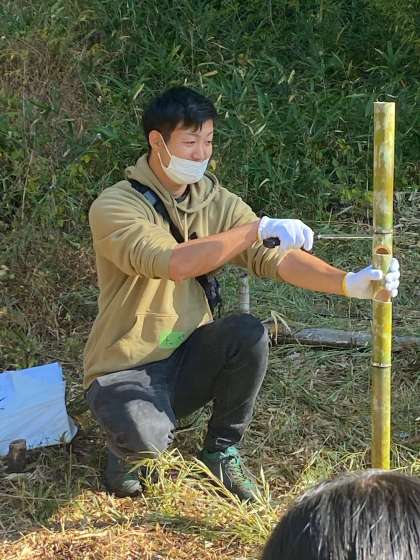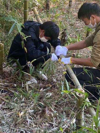 竹藪で竹の選び方、ノコギリの使い方、狩り出し方のレクチャーを受けて、いざ竹取り体験へ。
