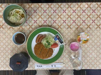 ホテルで用意してもらった、トンカツにうどんとボリューム満点のランチをいただきました。