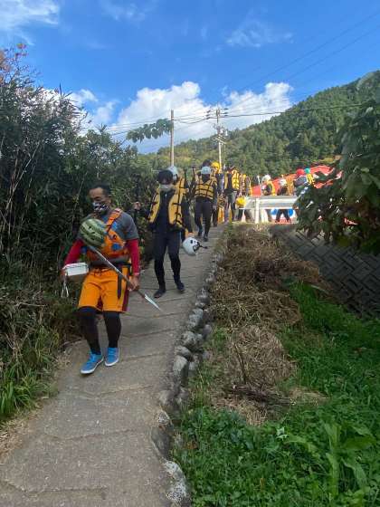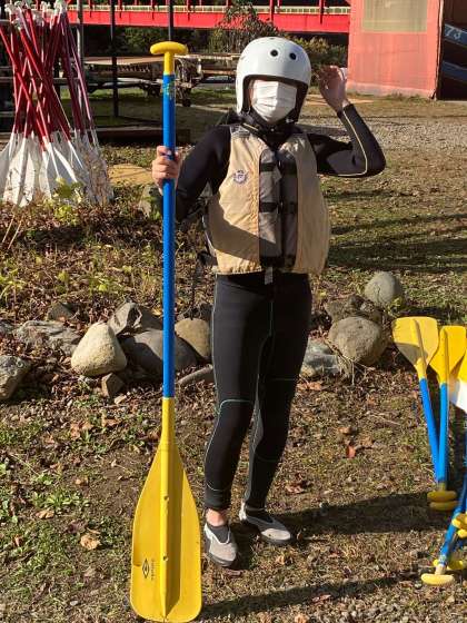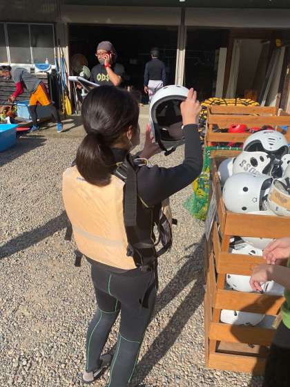 バスを下車してラフティングクラブハウスへ、ウエットスーツ、ライフジャケット、ヘルメット、ウエットシューズ、パドルを受け取り準備完了!
