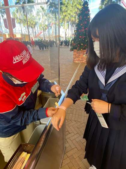集合写真の後は、担任先生の指示のもと、各自ゲートでチケットと交換にリストバンドを付けてもらい、いざ出陣!