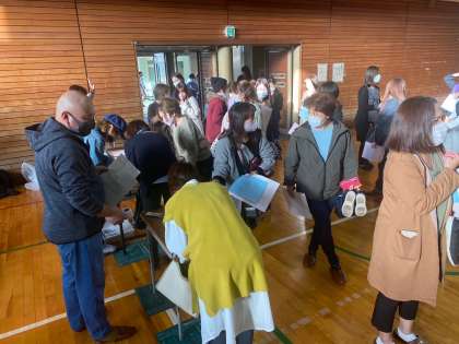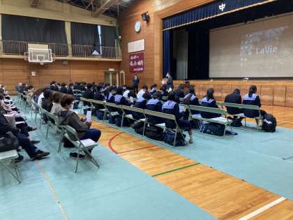 三年生の『集団行動』を観覧して頂いた後、引き続いて体育館で本年度2回目の進路説明会を3年生生徒も参加する中、行いました。
