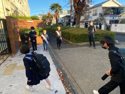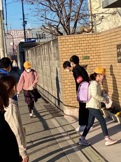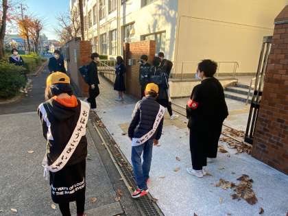 双方の児童会と生徒会が両校の正門前で朝のあいさつを交わします。