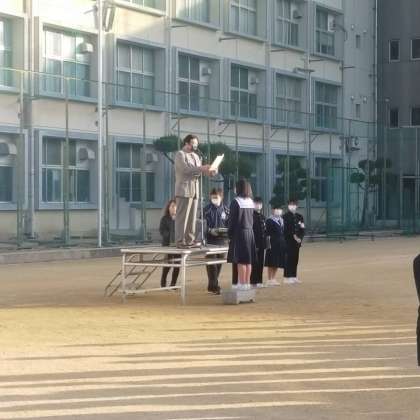 12月20日、今日は今学期最後の全校集会が運動場でありました。