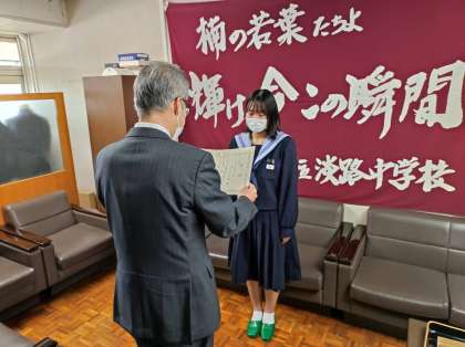17日に東淀川区税務署から署長さんが来校され、校長室にて令和3年度『税の作文』の受賞の報告とその授賞式が行われました。