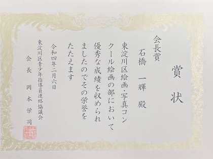 大阪市の写真・絵画コンクールの山脇さんの受賞に続いて、本校生徒の石橋一輝くんが東淀川区写真・絵画コンクール、絵画の部に於いて、会長賞を受賞しました。