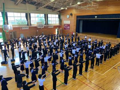 気候の変わり目からか天候も不安定ではありますが、生徒達は先日の服装調整期間の廃止についてのお話から、生徒自らの判断で服装を調整して、自分自身が過ごしやすい工夫し、今日の全校集会に参加してくれています。ただ、やはり連休の中休みということで、眠たそうな表情が見られて、先生も生徒大人も頑張る1日がスタートしました。