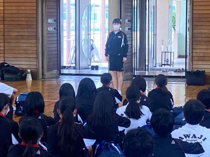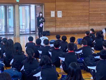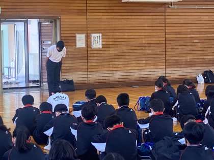 学年主任の杉本先生からの諸注意の後、持ち物・忘れ物点検が終わり、生徒代表による出発式です。