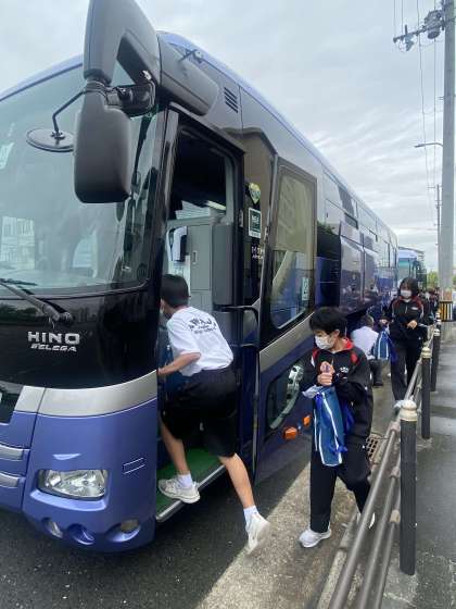 出発式を終え、いよいよ乗車、一路信太山青少年野外活動センターへ