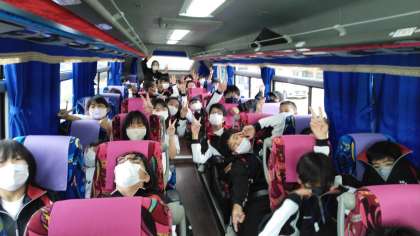 バスに乗り込み、学校へ向かいます。まだまだ元気な様子です!