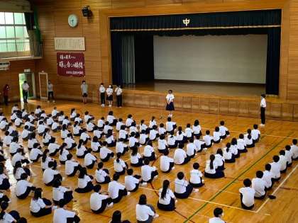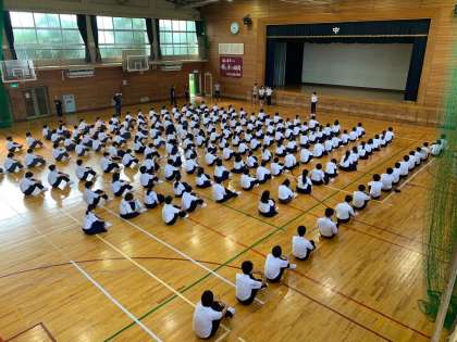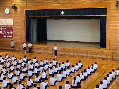 今日は毎週月曜日定例の全校集会がありました。梅雨入りし、ジメジメと湿度が高く、更に気温も高いため、なかなかしんどい気候ですが、今日も淡中生は元気です。