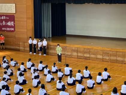 保健室の西浦先生からは、熱中症予防について、お話しがありました。熱中症予防を意識したマスクの正しい使い方、水分補給のために水筒を準備すること、睡眠時間をしっかりととることを意識してくださいとお話しがありました。