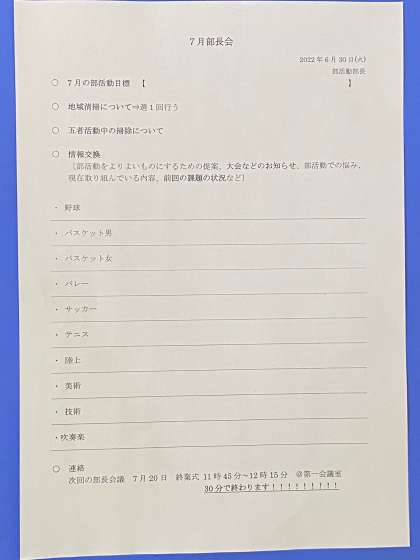 昨日、久しぶりに校長室で6月最後の部活動部長会議が行われました。