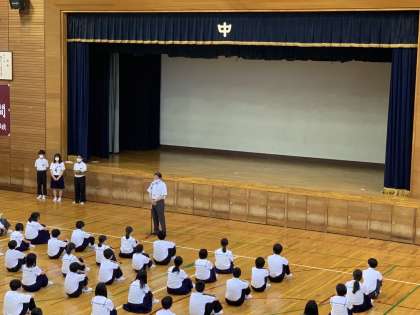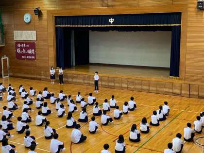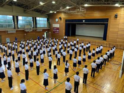 酷暑が続き、湿度も高い日々が続いていますが、淡路中学校の体育館での全校集会はエアコンのお陰で快適です。