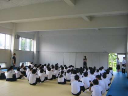 1年生は格技室(武道場)に集まって集会です。学級代表が司会を務め、会が進んでいきます。先生からは現在行われている全英テニスの話題から「ルールとマナー」についてのお話がありました。(テニスの試合ではルールはもちろん、マナーがとても重んじられるとのこと。)