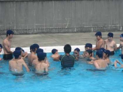 今日はクロールと平泳ぎの練習です。泳ぐときの姿勢(ストリームライン:流線型を意識した姿勢)や肘(ひじ)の角度&体の伸ばし方、(平泳ぎの)足のかき方などを教わりました。平泳ぎではペアを組んで足のかき方を互いに見合い、自分のイメージと実際の動きの違いを確認していました。
