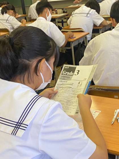 受検者は、英語の先生と相談しながら、自分の意志で受検級を選びます。やはり級が上がる毎に上級生の占める割合も多くなっています。ちなみに高校受験では私学で3級以上で受験得点補償や優遇措置、諸費用の減免措置をしてくれる学校も多数あり、また公立高校でも2級以上で当日の得点補償があるなど、進路獲得へのパスポートとなるこの英検にしっかりと1年生から取り組んでいきたいものです。