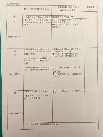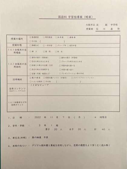画像は、月曜日の4時間目、国語の石川先生の授業案と授業風景です。