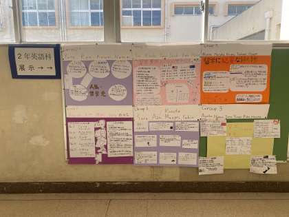 新東館2階の2年生教室前廊下と自主学習室には、英語科2年の生徒作品が展示されました。